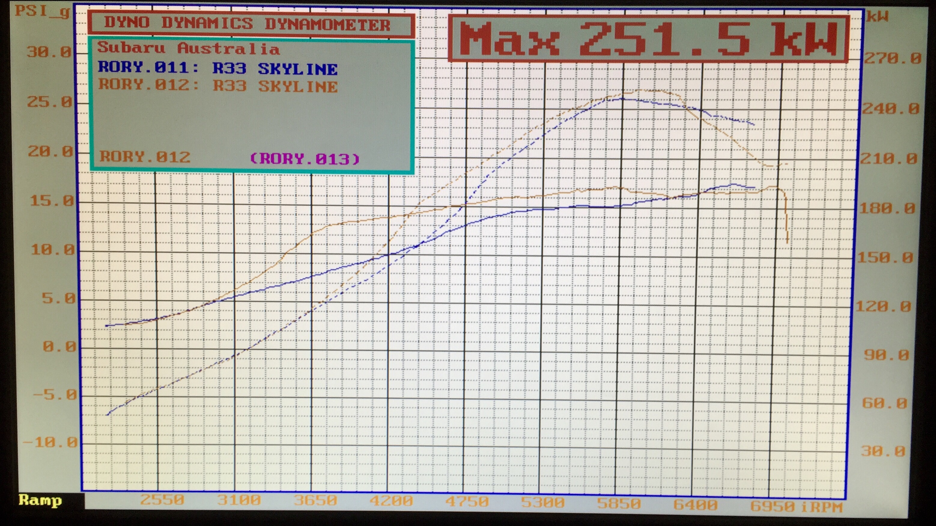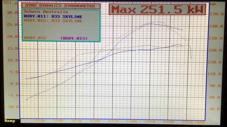 Vic, our tuner extraordinaire, ran a few light pulls to ensure everything was ok with the tune and all was looking well… But just as we tried for a slightly higher (only 18psi) pull on the Dyno that was enough to destroy the – already suspect – turbo bearing and caused the compressor blades to foul on the housing, hence the exhaust smoke and sound of the blades ‘tinking’ at the end.